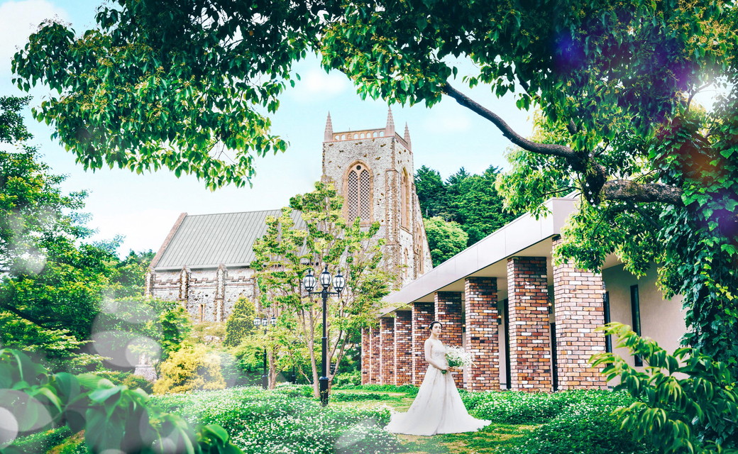 光が降り注ぐ森を抜けると、そこには希少な教会建築。神秘的な誓いの場は、誰しもを静かな感動に誘います。