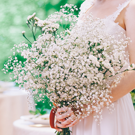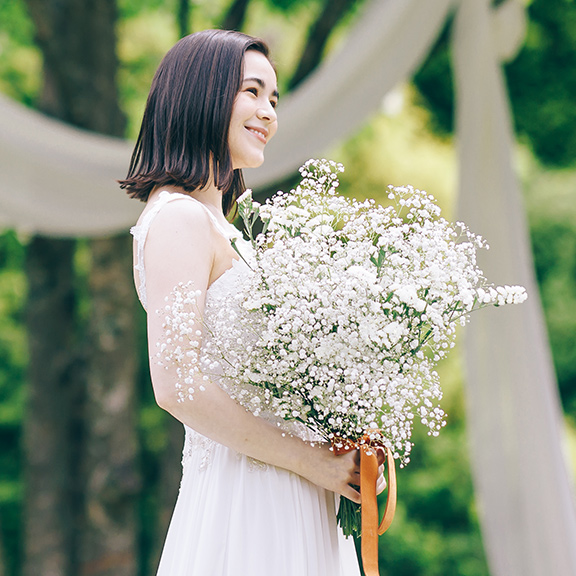 広大な森の結婚式。遠くから見ても伝わるボリューム感が可愛いカスミソウブーケがぴったり。
