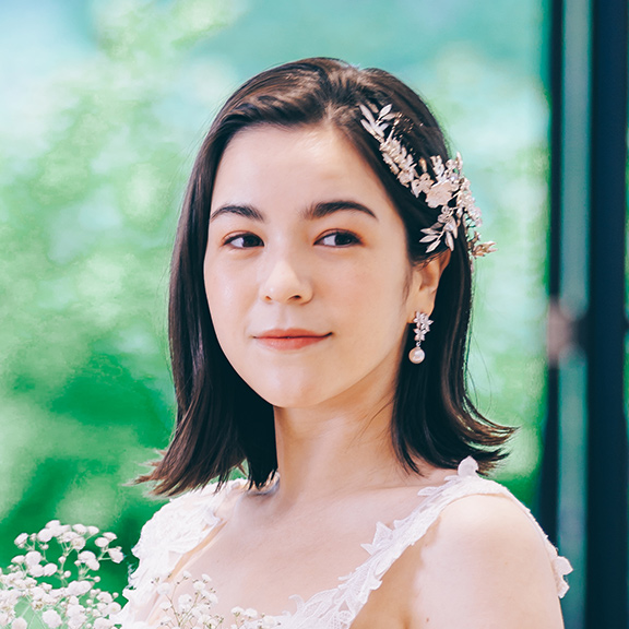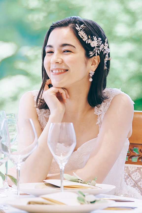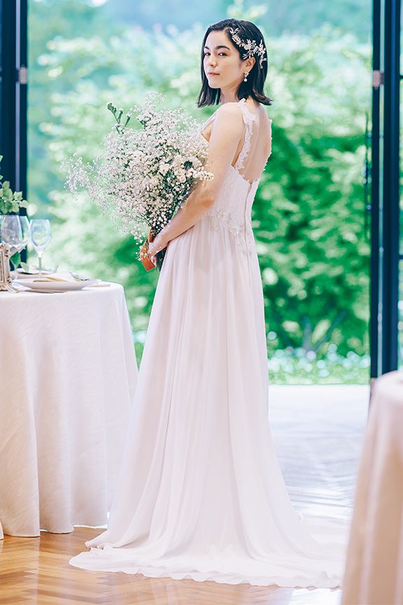 柔らかく揺れるスカートは森を抜ける風のように軽やか。背伸びしすぎない身軽な自分で、でも可愛く、心から結婚式を楽しむ。