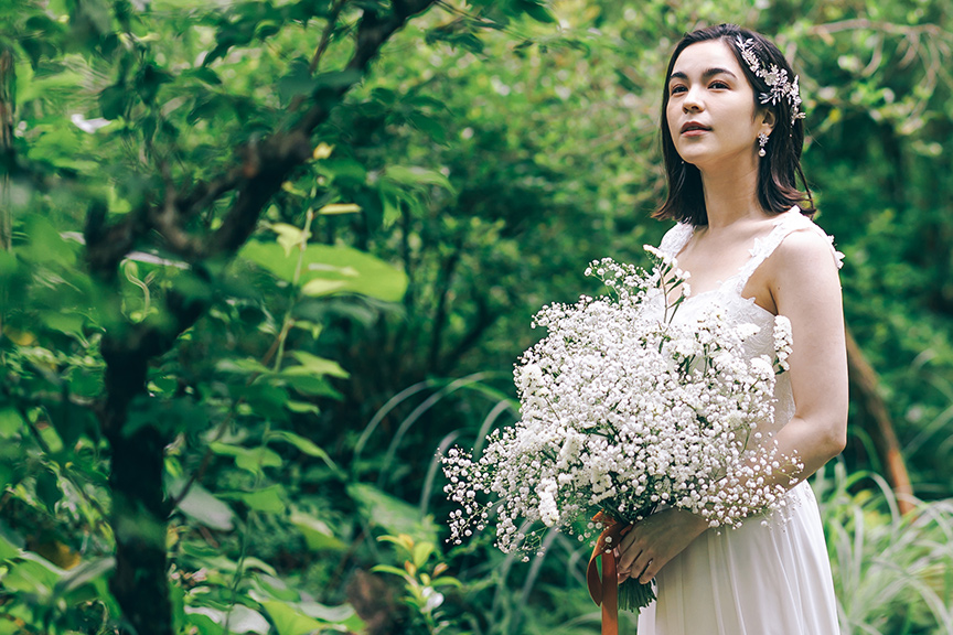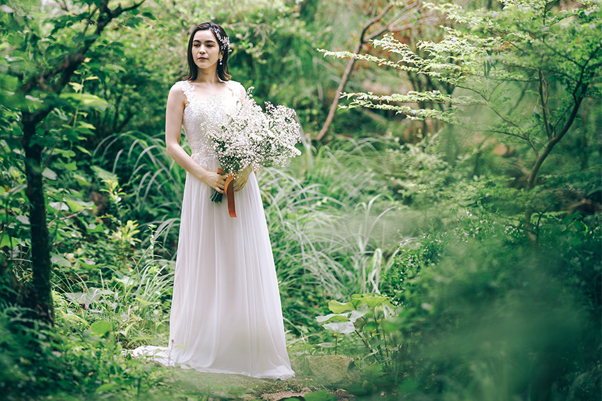 森の澄んだ空気と風が通り抜けるウェディングドレス。軽やかな質感が森の空気と色に馴染む。